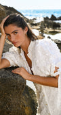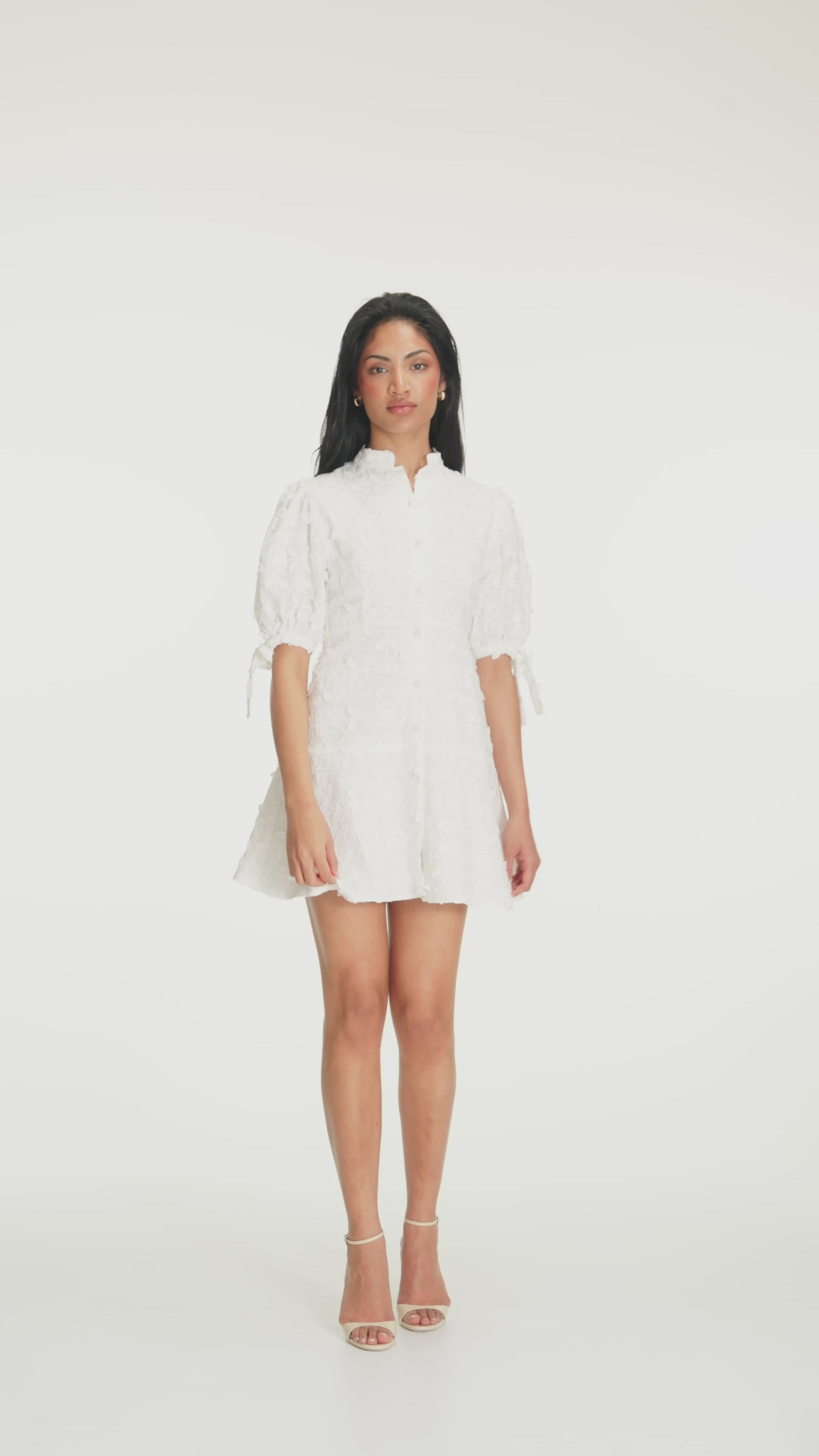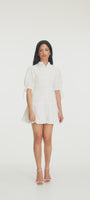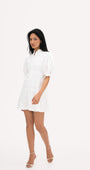 Cut in a flirty yet elegant mini silhouette, it features buttons along the front and tie bands at the sides of the sleeves, subtle details that elevate the look while keeping it effortlessly feminine. Timeless, refined, and endlessly wearable.